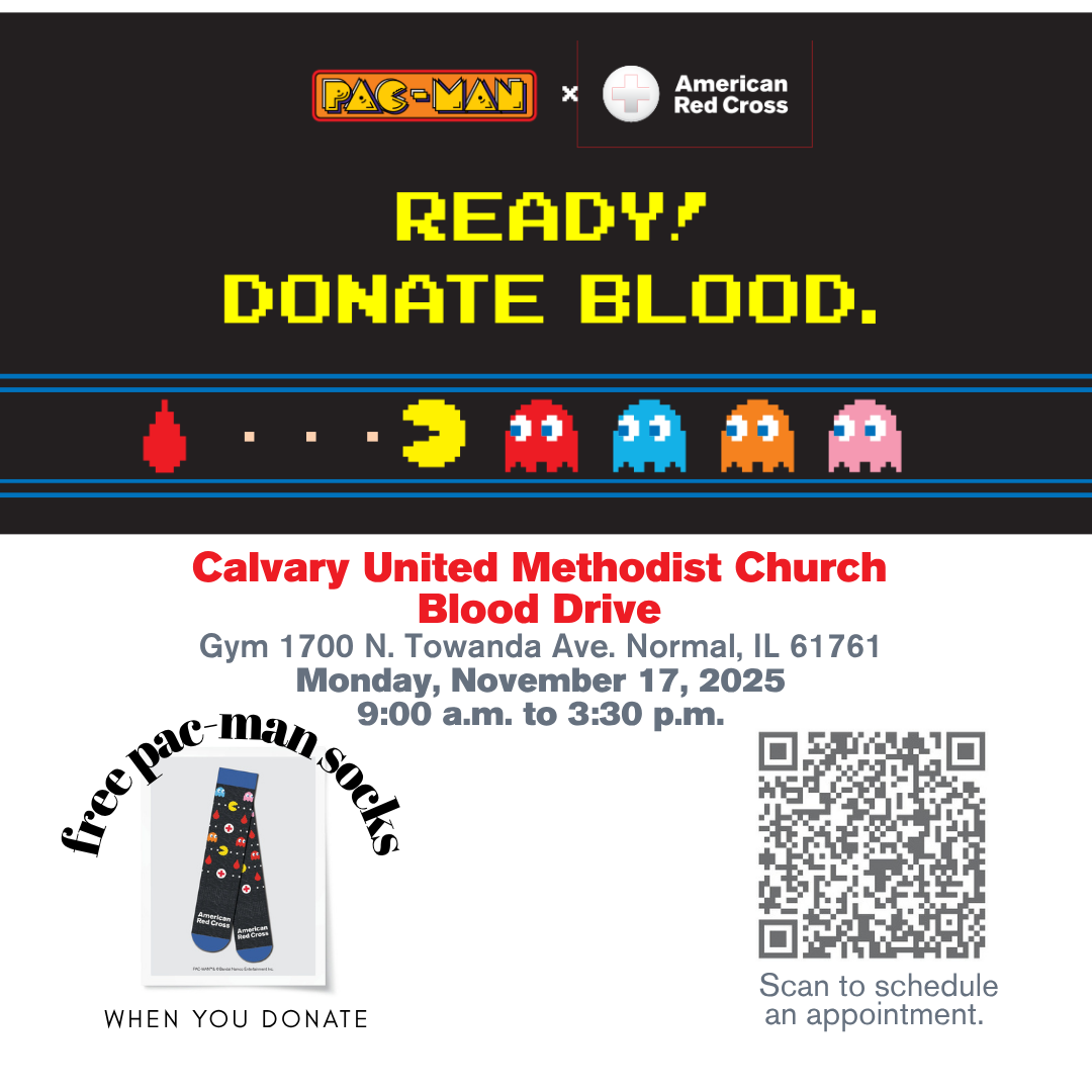 Join us for Calvary’s blood drive in the gym on Monday, November 17. Walk-in or sign up for a slot from 9 a.m. to 3:30 p.m. and receive a pair of Pac-Man socks for participating.