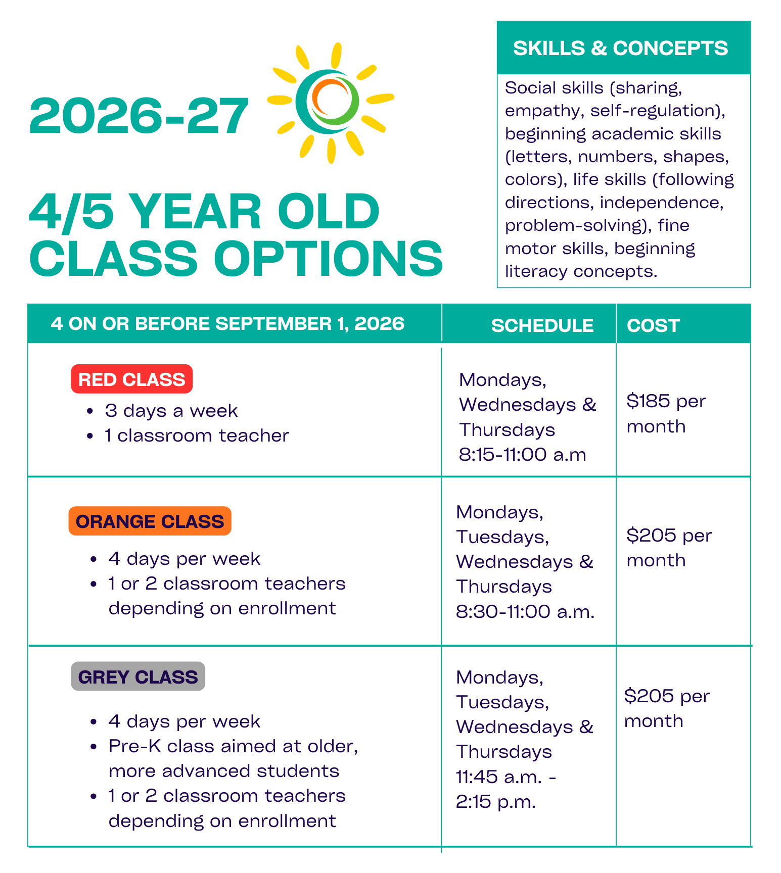 * A non-refundable registration fee of $100 is due at the time of registration. This fee provides a spot in the class, classroom supplies for the school year, and a school t-shirt (size is guaranteed if registered by June 30, 2026).